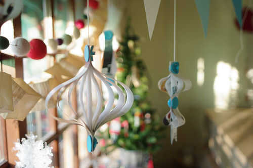 hacer simples ornamentos hermosos de Navidad antigua envoltura de regalo. Todo lo que necesitas es viejo regalo papel y Makedo vuelve a los pernos y re-clips en mymakedo.com.