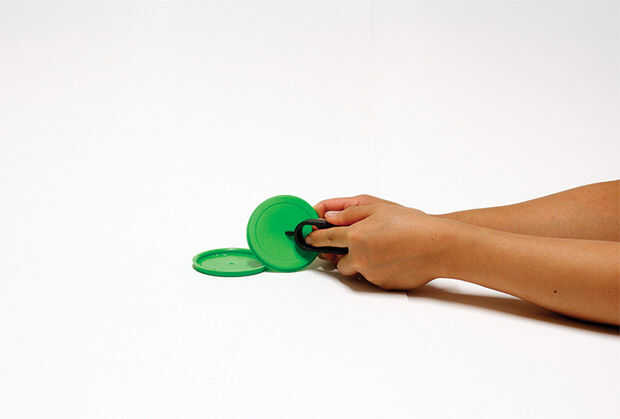Con la Sierra de segura de Makedo, perfore agujeros en el centro de las tapas de yogur. Coloque el lápiz en los agujeros perforados con el disco de vinilo entre.