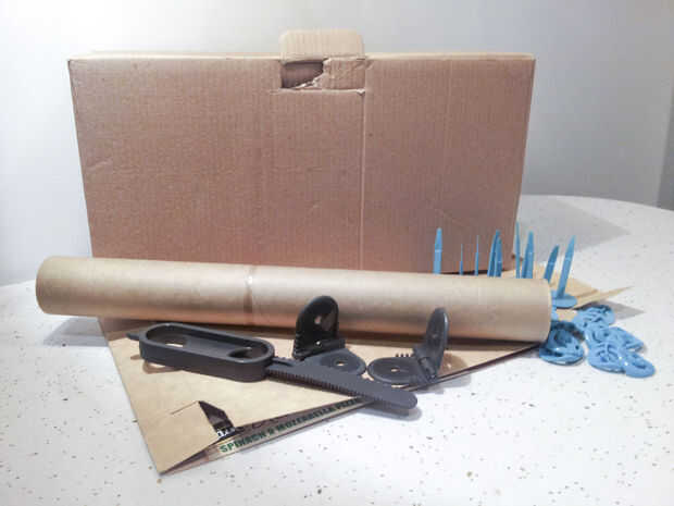 Recoger sus materiales. Para esta caja de herramientas es necesario un largo rollo de tarjeta (cling wrap o similar), un cartón y una caja rectangular que es aproximadamente la misma longitud que su rollo de tarjeta. Asegúrese de que tiene sus partes de Makedo prácticos.