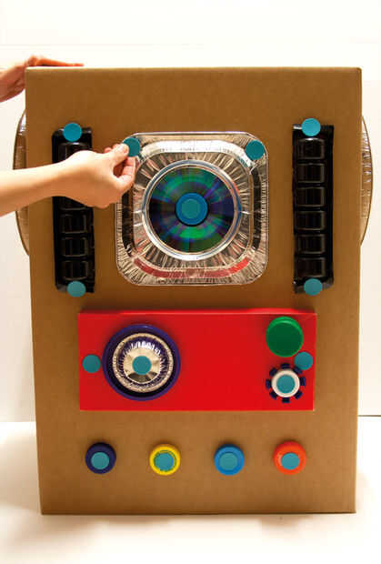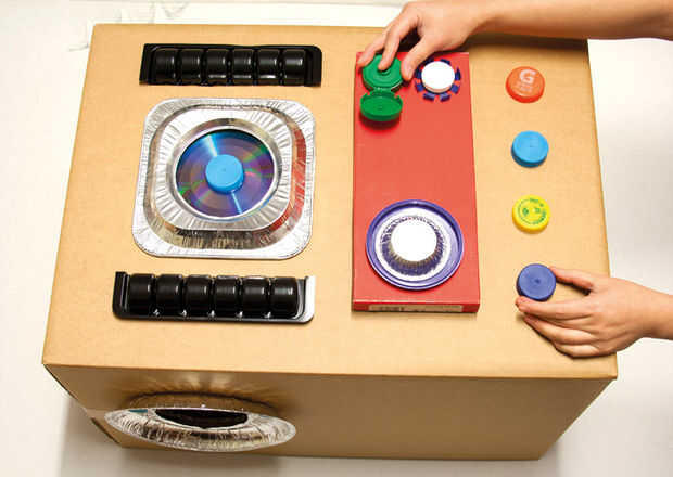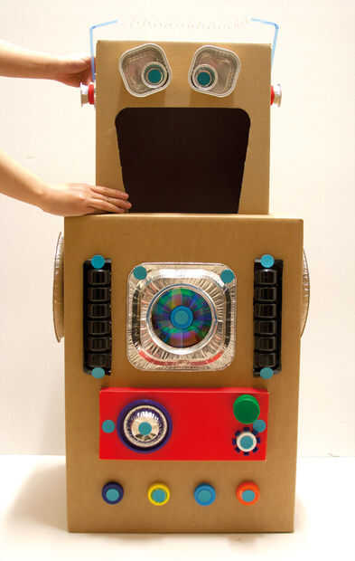 Conectar los accesorios con Makedo volver a clips. Luego coloque la cabeza en la parte superior del cuerpo y utilizar la caja fuerte de Makedo-Sierra para cortar un agujero en la parte superior de la caja del cuerpo, del mismo tamaño que la caja de cabeza. Conecte las dos cajas con cerradura Makedo-bisagras y re-clips en los lados de la caja.