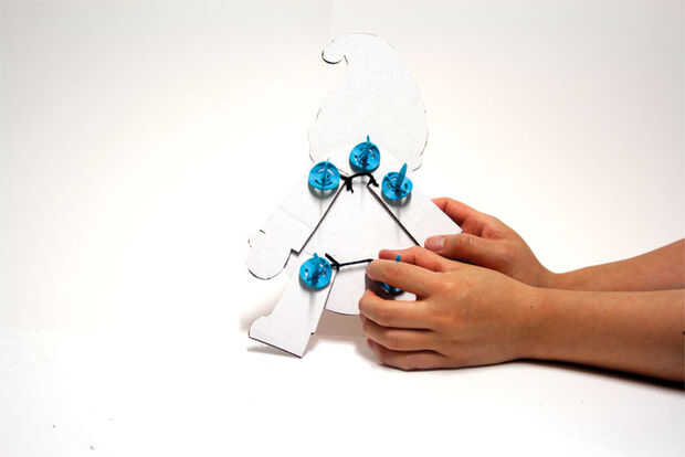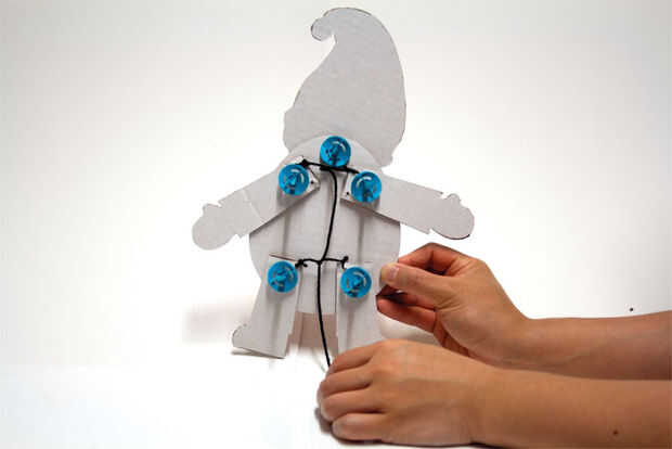 Por último, atar una cadena más larga en el centro de cada puente de cadena que acaba de terminar. Cuando tire de esta cadena los brazos y las piernas de su Santa saltar va a bailar arriba y abajo!