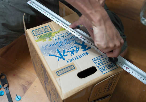 Comenzar colocando la caja sobre su lado. Utilice el punto extremo del segura-Sierra de Makedo y puntuación de la parte inferior de la caja hasta el punto de centro de la parte superior de la caja.
