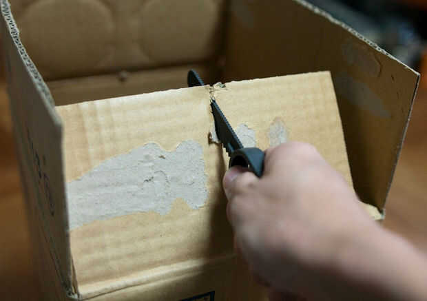 Segura-Sierra de Makedo y vi el centro de la solapa superior para cumplir con el punto de donde la puntuación línea cumple. Repita el paso 2 y 3 en el otro lado de la caja.