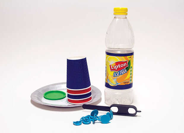 Para hacer su colector de viento de Makedo necesita a tazas de papel del origen, un plato de papel y una grande vaciar la botella. ¡ No olvides tus piezas de Makedo!