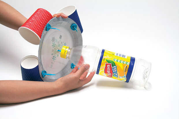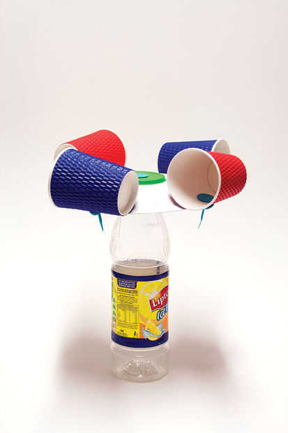 Conectarse a la placa de la tapa de su botella. Su colector de viento Makedo es ahora completa. Tener al aire libre en el viento y verlo girar. Puede llenar la botella con agua para mantenerlo de pie vertical.