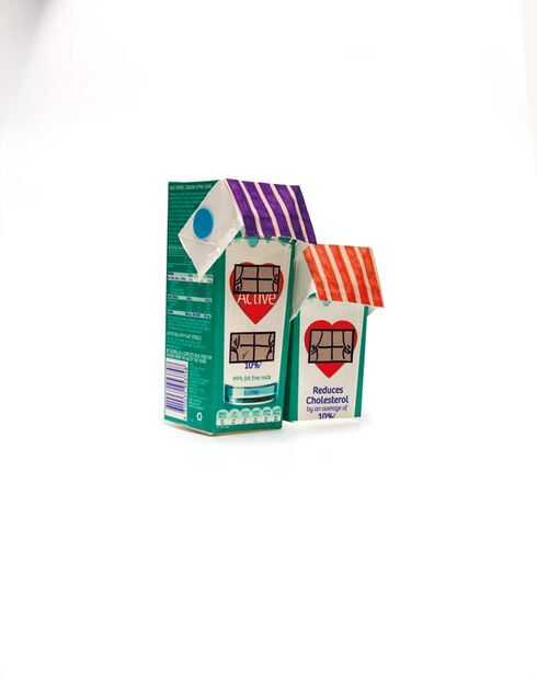 Para completar su creación, necesita casas y tiendas para su pueblo. Cartones de leche de origen y utilizar la caja fuerte de Makedo-Sierra para cortar a través de tres lados de la parte superior de la caja de leche. Doble hacia abajo como se muestra y conectar las aletas sueltas a ambos lados de su cartón de leche con Makedo volver a clips. Este es el toldo. Decorar para añadir carácter único a cada edificio.