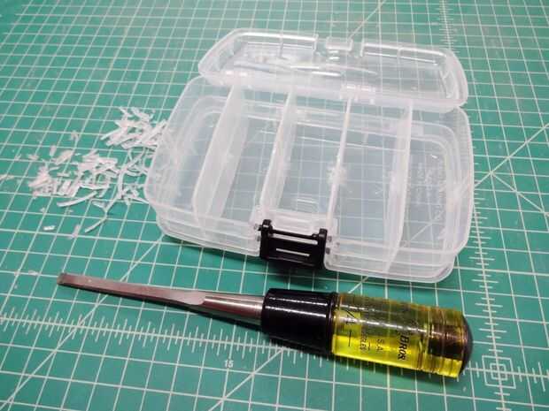 Para el caso que he utilizado, viene con separadores de compartimento extraíble y cada Bahía poco tiene que sobresalen labios que sostienen los divisores en su lugar. Encontré estos labios divisor para estar en el camino, eran cuidadosamente raspadas hacia fuera y quitados con un cincel de 1/4 sharp ".