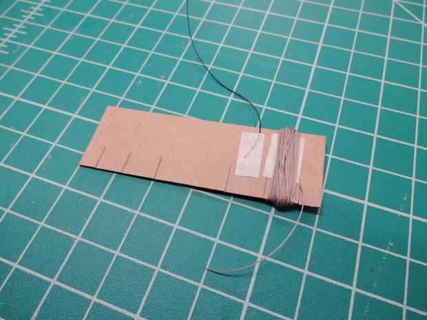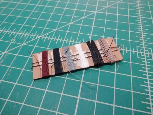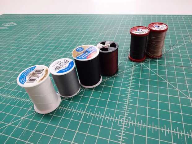 El kit de costura fue hecho envolviendo unos 15 pies de una gran variedad de hilos alrededor de un pedazo de cartón delgado. Cuatro de los hilos de rosca son hilo liviano, y dos de ellos son más grueso hilo de tapicería. Incluí un par de agujas de coser a mano regulares, así como un par de agujas de deber más pesados para el hilo de tapicería.