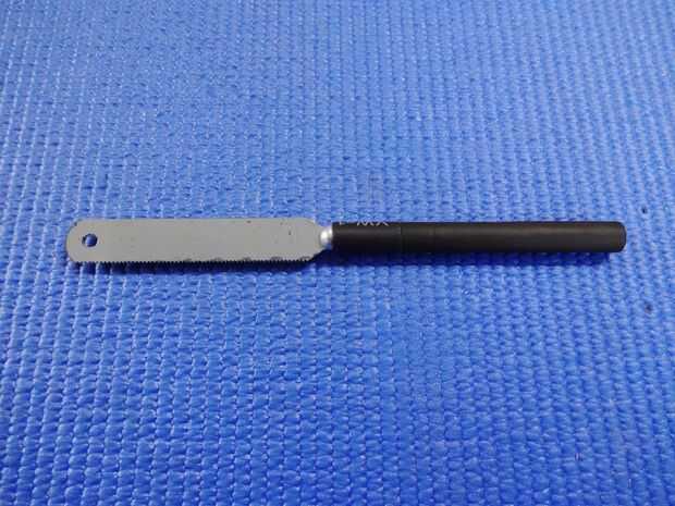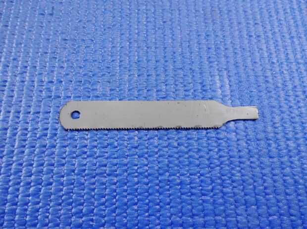 Un pedazo de una hoja de Sierra de corte de metales fue ajustado para encajar el mango x-acto así. (Esto fue una idea brillante del usuario K.hall86--gracias!) Creo que esto será especialmente útil para cortar pequeños trozos de madera, en lugar de metal. De cualquier manera, es bueno incluir como toma prácticamente sin espacio.