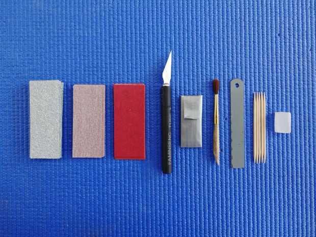 En este compartimiento tengo papel de lija en una variedad de granos, un asa de la modificado x-acto con hojas, un pincel modificado, un pedazo de una hoja de sierra, palillos de dientes y un poco de cera de parafina.