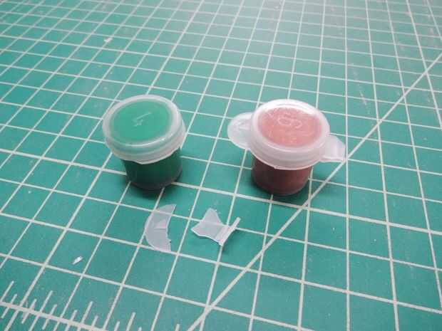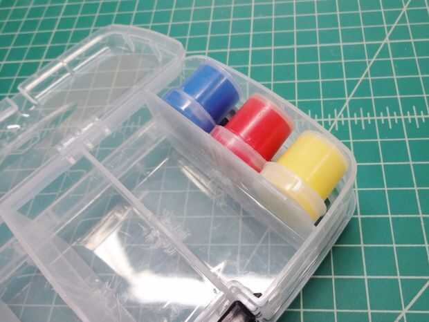 Seis tinas pequeñas de pintura ahora caben en este compartimiento doble, aunque tuve a primer ajuste de los tabuladores y bisagras de cada tina. Tenía habitación para seis personas, así que me fui con las primarias además de verde, blanco y negro.