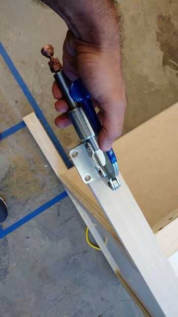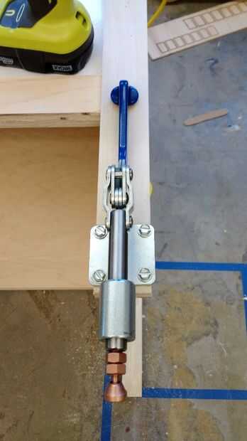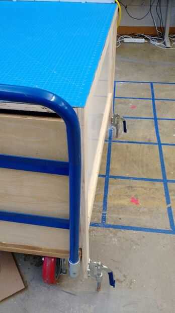 Si tu carro tendrán que viajar a través de puertas que son más estrechas que 32" necesita mover los tensionadores de sujeción rápida para el frente y la parte posterior de las patas del carro en lugar de los lados. (ver última foto en esta página para que la configuración) Use pequeños pedazos de 3/4" madera contrachapada a las piernas en ángulo recto para proporcionar una superficie para colocar las abrazaderas.