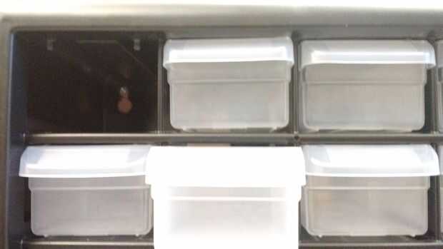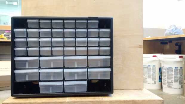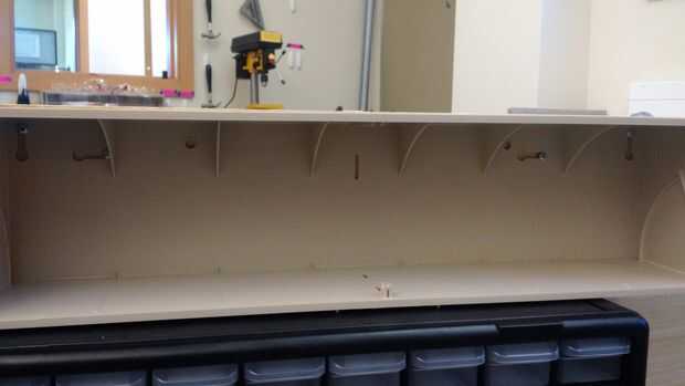 2. una cajonera de plástico e incline bin a la pared frontal del carro. Remueva cajones y bandejas según sea necesario para marcar la colocación de tornillos.