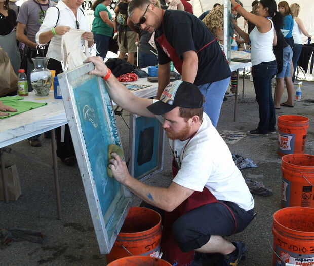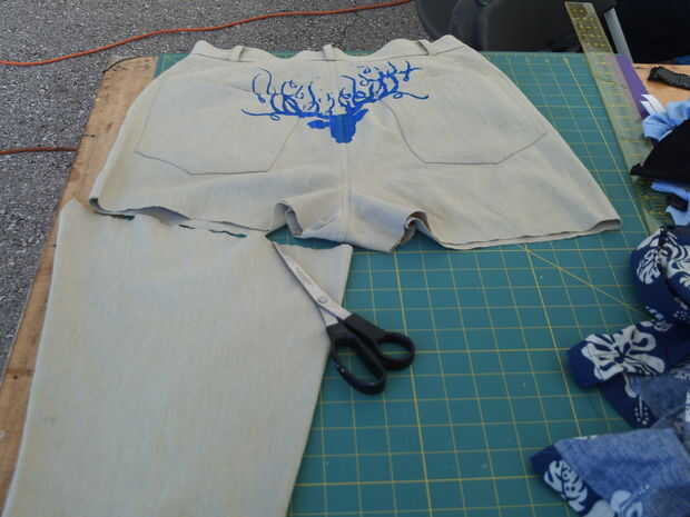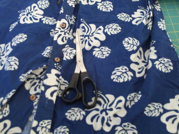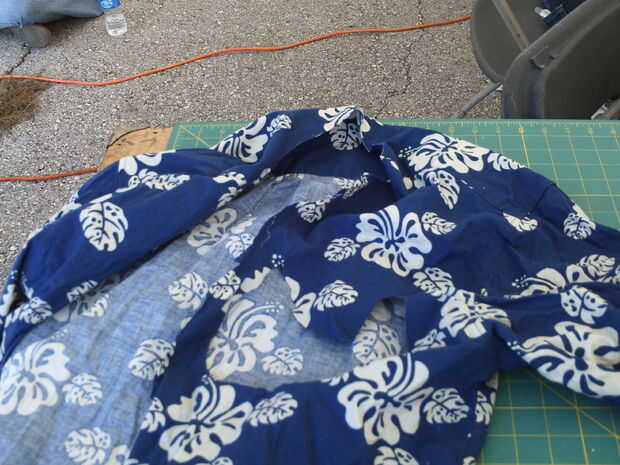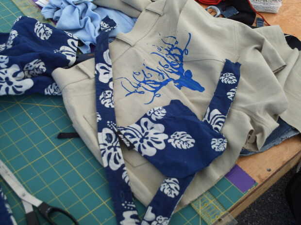 Iba a hacer otra bolsa de jean, pero encontró unos pantalones de vestir en su lugar. Acentúa la cintura/parte superior de la bolsa con los pedazos de una camisa hawaiana. Para las bandas, quitar algún hilo flores y mariposas de una camisa y coser en. Puesto que eran lo suficientemente buenos para hacer serigrafía para nosotros, pensé tendría que hacer también. (Tardó aproximadamente una hora para hacer).