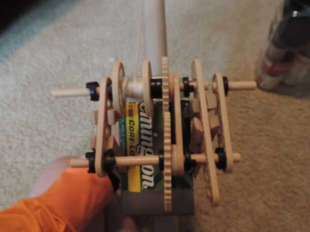 Utilizando el conjunto de malacates del kit Maker Studio de ThinkFun construí un tranvía que pequeños objetos desde un extremo hasta el otro extremo elevado. Quería utilizar sin herramientas y sólo hogar cosas por lo que cualquier niño podría constru