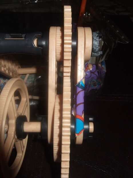 Para construir el tren de la impulsión, utilizas tus dos ejes largos. Monte ambos ejes a cualquiera de los extremos de un conector corto de la barra, utilizando cubos para localizar el conector de la barra más cerca de uno de los extremos de los ejes que otro. Luego colocar los engranajes, uno en cada eje, con los ejes de fijación. A continuación os pongo "las ruedas" al lado de los engranajes. Esto era esencialmente para ayudar a mantener los engranajes perpendiculares al eje y para ayudar a alinearlas. Coloque una segunda barra conector corto y deslice los cubos para mantener en su lugar, pero no bloquear la barra en el eje. Poner el motor de goma, con sus dos cubos de bloqueo, junto al pequeño engranaje en un mismo eje.