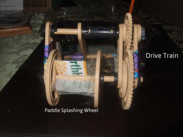 - Desea que el equipo grande en el mismo eje como la rueda de la paleta. ¿Por qué? Porque usted necesita un montón de esfuerzo de torsión para hacer girar la pala. Esfuerzo de torsión es esa fuerza que se necesita hacer algo alrededor de su eje. Cuando usamos el gran engranaje en el eje mismo de la paleta, con el pequeño engranaje "conducir" (usando nuestra goma "motor"), que son capaces de sacar más par que ponemos en (por supuesto, nada es gratis... que el engranaje pequeño tiene que girar más).