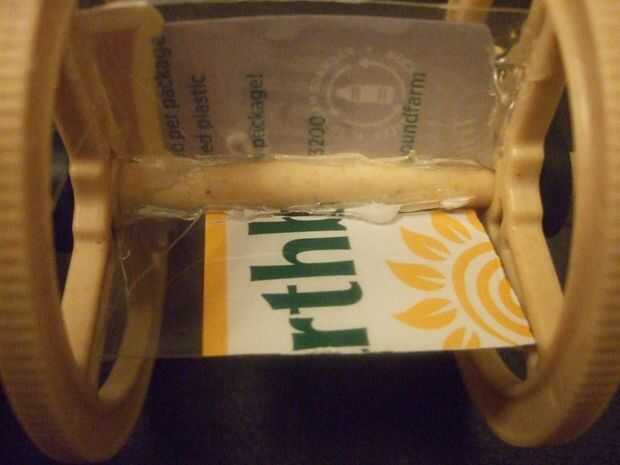 Usar dos de sus ruedas restantes como ayudas de lado de las paletas que cortan fuera de la tapa del envase plástico. Pegamento caliente sus palas al eje (Recuerde, usted debe estar en el eje con el engranaje grande) y la rueda de "rayos" para la estabilidad.