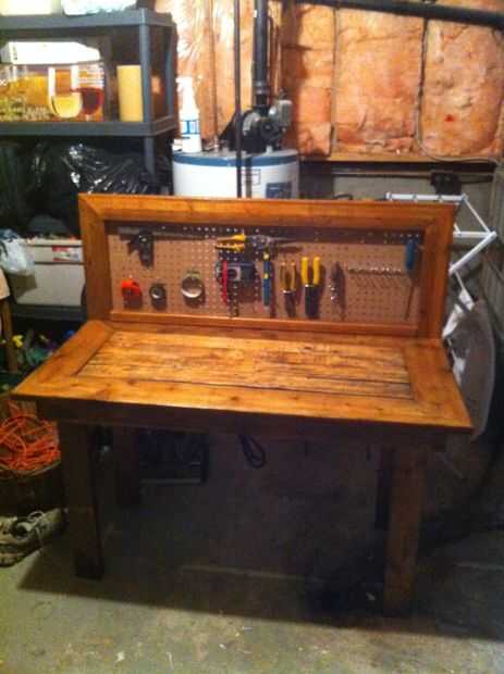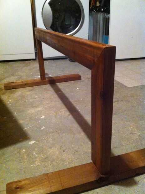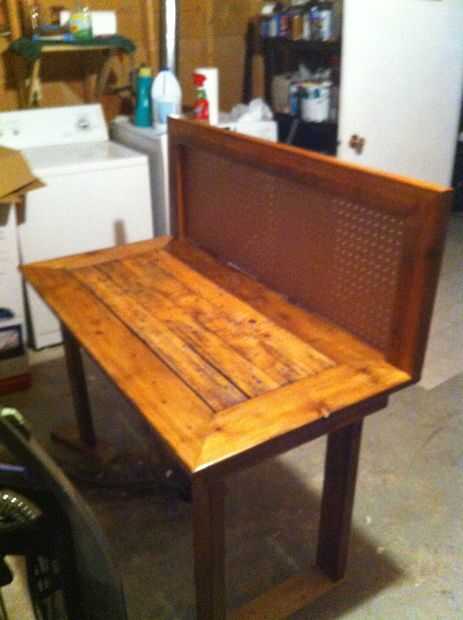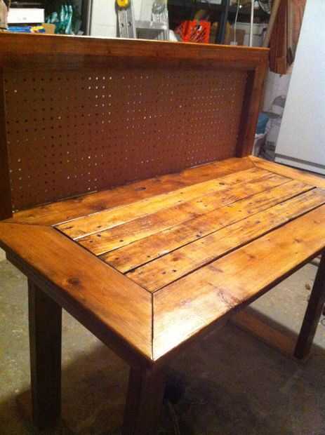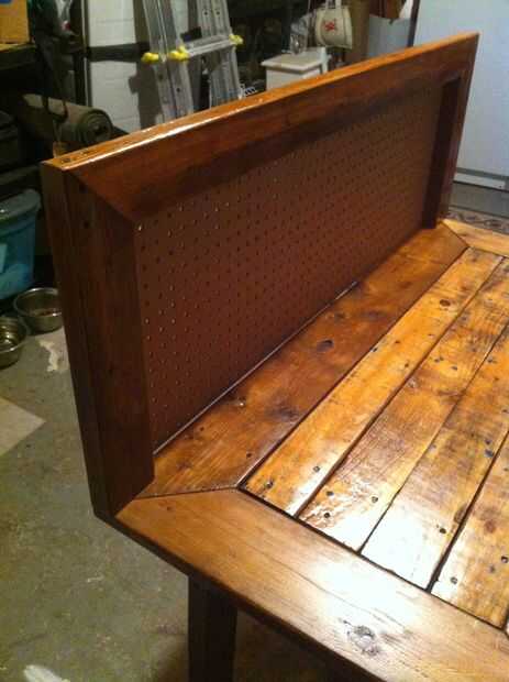 Después estaba casi terminado, he decidido que quería tener un respaldo de tablero de peg pequeños para colgar las herramientas que utilizo más a menudo. Simplemente corte una pieza de 2 x 4 la longitud de la mesa (49,5") para la parte superior y dos piezas de 2 x 4 a la altura deseada (en mi caso, 18") y luego cortar los extremos en ángulos de 45 grados que las tres partes se reúnen y les atornillan. He tomado prestada la Sierra de mesa de mi papá y arrancó un 2 x 4 para la parte inferior del marco de la que os adjunto luego, para que se vea un poco más acabado. Luego manchado y cubrió el marco para el tablero de clavija y había cubierto con acondicionador.