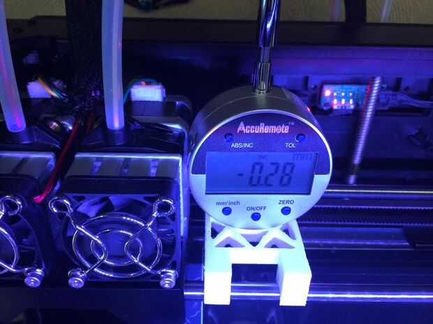 Nivelación de la plataforma de la construcción no significa que tienes la altura de la boquilla correcta. El truco que usé fue a nivel primero, moviendo a las cuatro esquinas, a partir de la parte posterior. Luego correr la placa hasta que se dispara el interruptor micro, cero el dial y luego vuelva a ajustar los tornillos niveladores para tener la placa de en -0,1 ", bicicleta en las curvas otra vez.