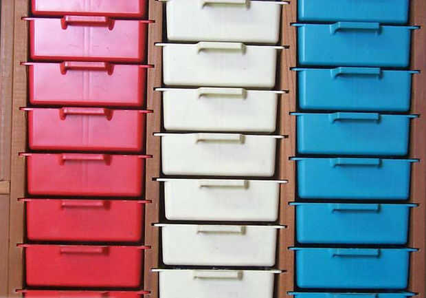 He estado buscando para módulos cajón barato durante varios años hasta que mis amigos de GarageJournal.com me avisó a una empresa comercial que hace algo casi perfecto. Cajones de Dandy son módulos de cajón de plástico moldeado que vienen en 3 tamaños y pueden montarse fácilmente en estantes o armarios ya que resbalan en las lengüetas de plástico moldeadas en el cajón. Todo lo que necesita es cortar ranuras en el lateral del gabinete para crear rápidamente un banco de cajones. El plástico utilizado es resistente y lo suficientemente flexible para evitar que se quiebren. Comprar en cantidad el tamaño pequeño (4-1/2 "x 7-1/4" x 1-1/2") cuesta menos de $1,50 USD por cajón. También venden las particiones que permiten subdividir cada cajón. Revisa su sitio web para más información tengo conexión a la empresa más allá de ser un cliente satisfecho.