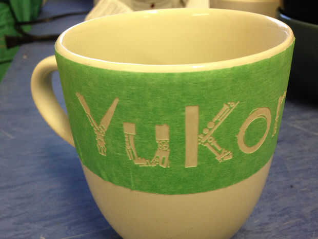 Decidí ocultar el área a ser grabadas en las tazas coloreadas más ligeras con cinta de pintor, para tratar de tomar ventaja de la plantilla que le dejó después de grabado y ver si pudiera de alguna manera color limpio en el área de grabado.