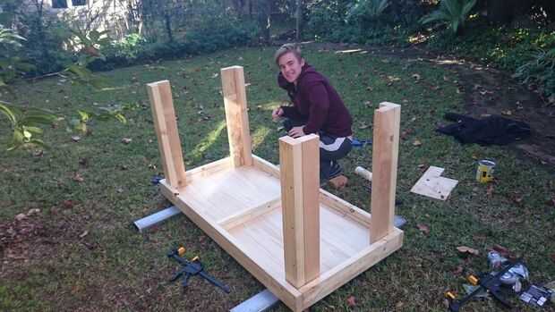 Encontré que era más fácil construir el Banco de boca abajo, construyendo sobre la mesa y luego bancos más de una vez. Esto lleva el peso de las piernas etc. mientras están tratando de montar el Banco, evitando cualquier deformación no deseada. Los pasos son los siguientes: