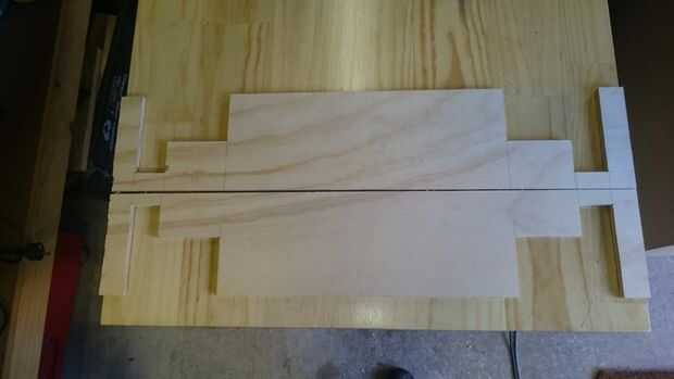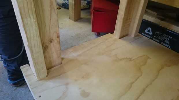 Debido al tamaño de las hojas de madera contrachapada en mi ferretería local y ahorrar dinero, la plataforma está hecha de tres piezas separadas. Pieza de un gran centro (en un ancho de 120mm que es un ancho de madera contrachapada estándar) y al final dos piezas que se forma para caber alrededor de las piernas. Te recomiendo que uses una sola pieza si esta posible evitar el cambio feo grano de madera y combinación obvia!