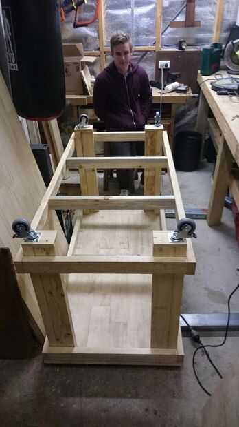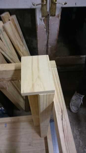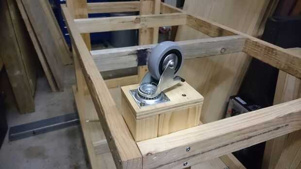 Puesto que era un poco torpe instalar las ruedas directamente en la parte inferior de las piernas (ya que la placa base de la rueda sobresale en el interior de las piernas en forma de L) añadí una placa base preliminar hecha de madera de desecho. Esta placa base se llevó a cabo en lugar con los mismos tornillos que sujetan la rueda al plato.