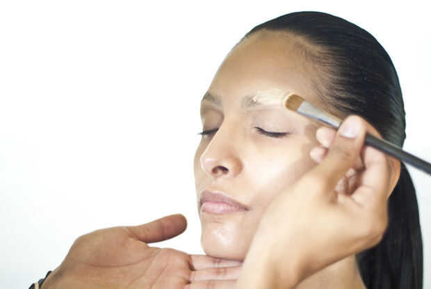 Este look comienza por convertir tu cara en un lienzo en blanco. Esto significa hacer las cejas desaparecen. Este paso trata de alternar capas de paintpot con capas de polvo. Utilice un pincel plano para aplicar el producto paintpot a tus cejas y luego un cepillo suave para aplicar el polvo. Paintpot alternativo y polvo hasta que se ha aplicado una cantidad suficiente de capas y los pelos están completamente cubiertos. Luego, suavemente, aplicar base o corrector sobre ellos, para volver a su propio color de piel.