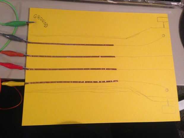 Un abierto bajo... de papel! Utilizando Makey Makey, cinta de cobre, un LED y algunos cables de puente.