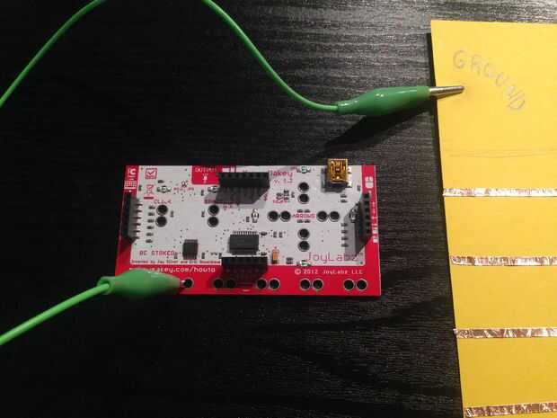 Ya que tu cuerpo es esencialmente el conector del circuito en este proyecto, vas a tener que hacer una ubicación fácil para conectar a tierra. El panel inferior del tablero Makey Makey titulado "tierra" es donde se puede conectar a tierra, entonces hay que tocar el extremo abierto de la pinza de cocodrilo a tu cuerpo para completar el circuito. He dedicado un lugar en mi papel al tacto al tocar el instrumento, pero también puede cinta el extremo abierto de la pinza a su cuerpo así que ni siquiera tiene que pensar en ello.