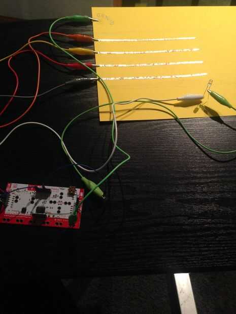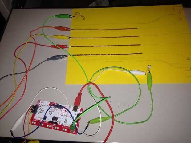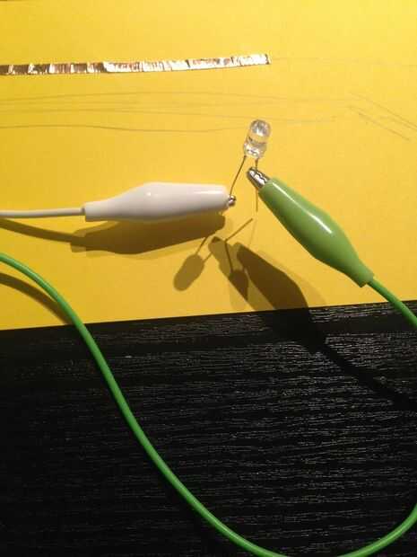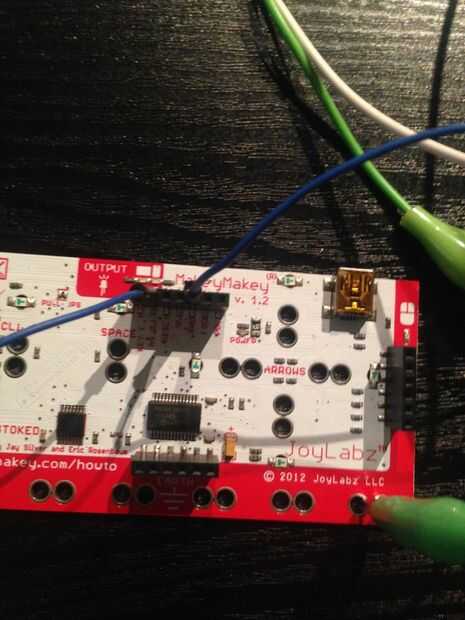 También puede Agregar un LED que se ilumina cuando se toca el bajo para la diversión! Para esto utilizamos el Banco superior en la parte posterior de la placa de Makey Makey o el Banco de salida. Las dos primeras ranuras en el Banco de salida están abiertas a todo lo que le gustaría colocar en el circuito, como un LED. La primera ranura envía señal a la salida cuando se produce una función de teclado, y la segunda ranura envía señal cuando se produce una función de ratón. Para este proyecto, vamos a usar la ranura del teclado. Deslice las patas del LED dentro de la ranura del teclado y la ranura de la tierra (o utilice cables de puenteo/pinzas para personalizar la ubicación de los LED). Ahora cada vez que se juega el bajo, la luz se apagará!