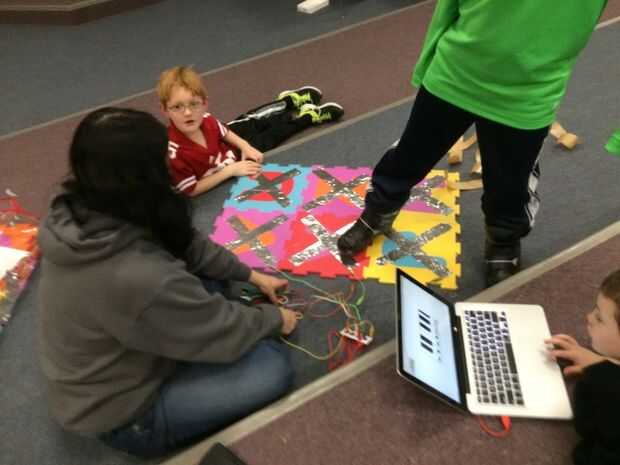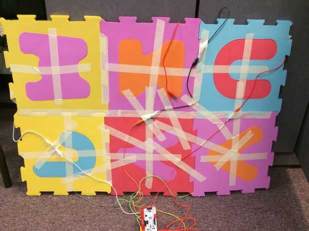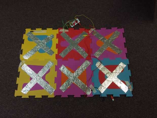 Con la estera de la danza con cinta de aluminio Xs en cada plaza, que era tiempo de colocar una pinza x para el control en el Makey Makey. Utilizando el programa piano desde la Web de Makey Makey, es una actividad simple para conectar el Makey Makey a nuestra pista de baile.
