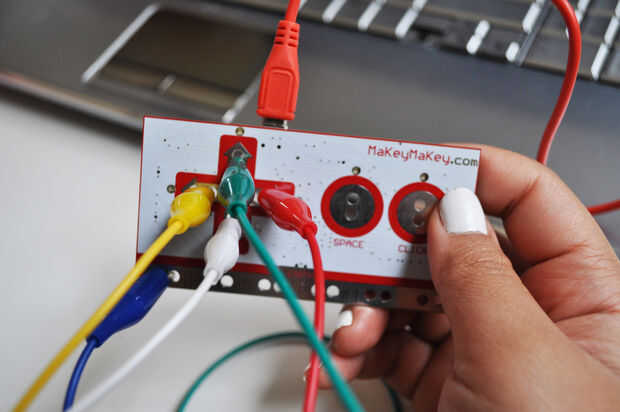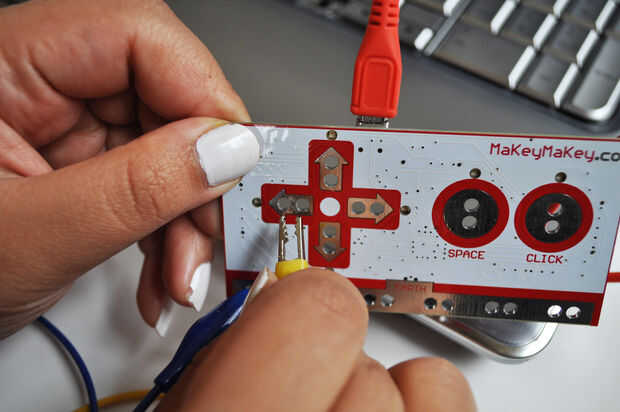 Pak vier andere krokodillenklemmen en verbind este la aan MaKey MaKey bij de pijltjes. DIT doe je puerta het abierto knijpen van het krokodillenklemmetje en dit vasta te maken aan de twee gaatjes van de op elke richting MaKey MaKey. Rechts op het placa zie je 'Espacio' en 'Click' staan. ALS je este verbindt se reunió con objeto de een en een krokodillenklemmetje, kun je este gebruiken als linkermuisknop en als spatiebalk tijdens het typen.