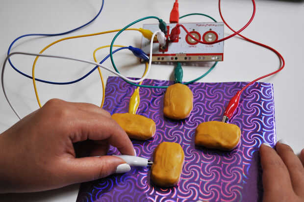 De MaKey MaKey es nu verbonden met de permiten enlaces, der., boven en onder. De computadora neemt aan dat dit nu een onderdeel van je toetsenbord es. Maak van speelklei vier pijltoetsen en pierna deze op papier. Verbind de andere kant van de krokodillenklemmetjes aan de vier pijltoetsen van klei die je hebt gemaakt.