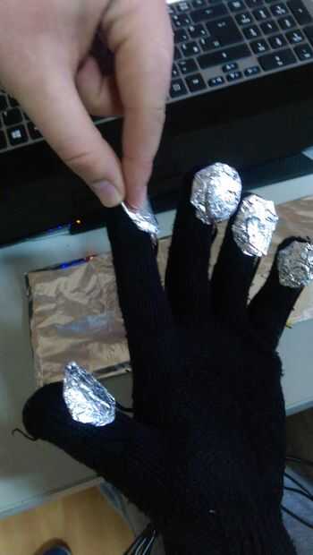 2. En cada sensor de dedo pone algún plástico derretido y luego pega en los dedos del guante.