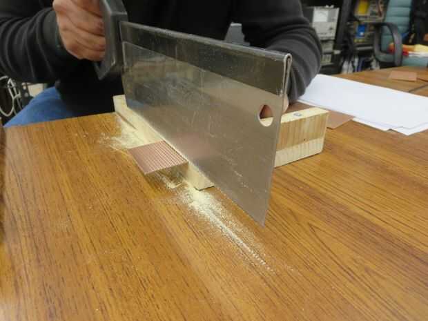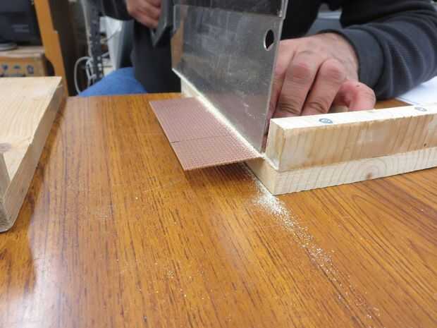 Hemos marcado la veroboard y ser del mismo tamaño que el Makey Makey, corte con cuidado la Junta utilizando una sierra de Tennon. El Tennon vio hace grandes líneas rectas, pero es un poco agresivo, así que no vi demasiado rápido.