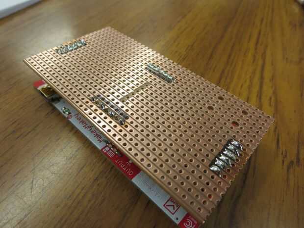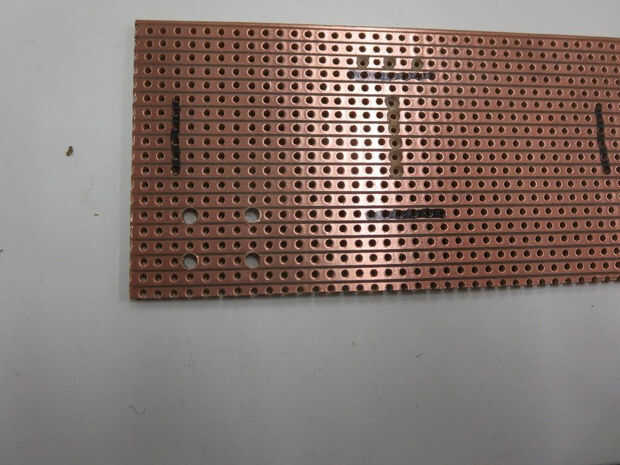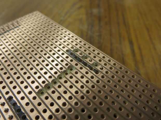 En la parte inferior que todos los pernos están conectados con el mismo conector de tierra, así que no importa que la cabecera es un cortocircuito hacia fuera con las pistas adyacentes de la veroboard.