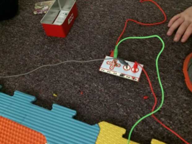 Conecte la pinza cocodrilo a la esquina de su área de cinta de aluminio interactivo y fije el Makey Makey.