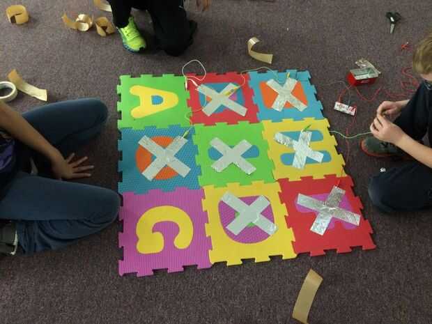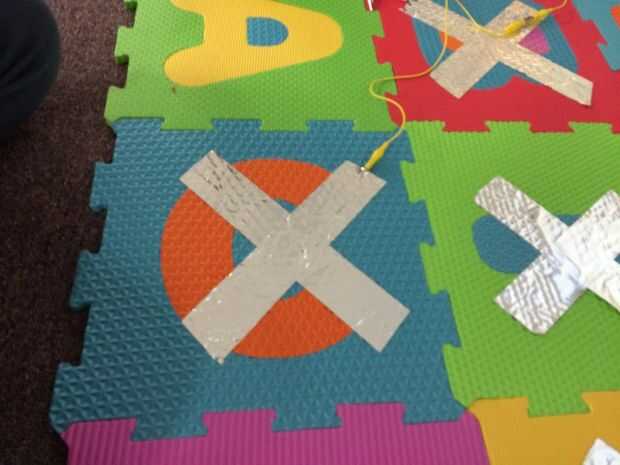 Usando la cinta de aluminio, crear un espacio interactivo que cocodrilo enganchado a las flechas Makey Makey. Utilizamos Xs pero si tienes más material de cubren más de la pieza de espuma en su lugar para crear tanto un espacio interactivo como sea posible.