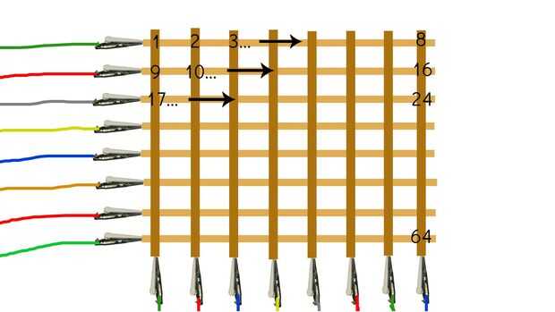 La solución consiste en multiplexar las filas y columnas. Creamos 8 filas y 8 columnas de la cinta de cobre - cada línea conectada a su propia pinza de cocodrilo - y por la intersección de una fila y una columna de conexión a tierra, activará una clave única. Hay 64 puntos de intersección que pueden activarse con sólo 16 entradas Makey Makey.