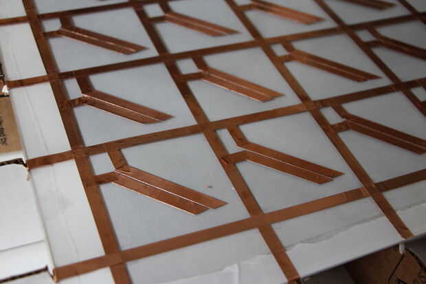Iniciar colocación de columnas de la cinta de cobre en la superficie del vidrio. Es útil tener el LED encendido por lo que podemos alinear la cinta con la cartulina. - Cinta no conductora