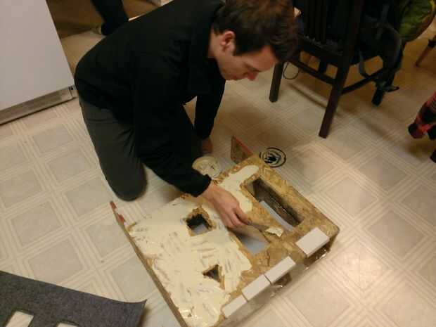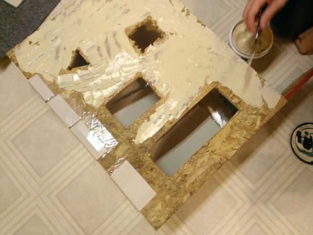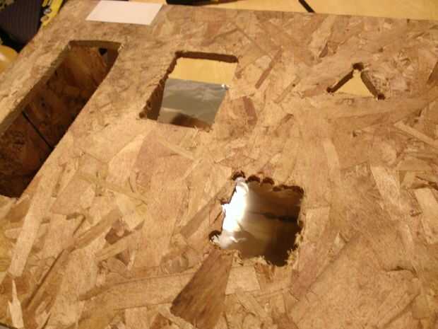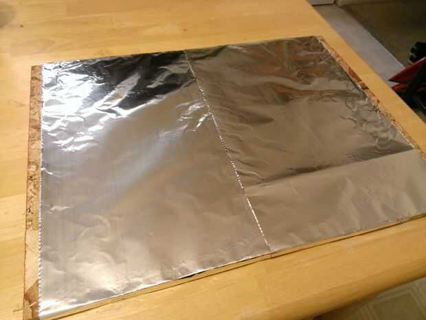 Una vez que el frente corte colocar una hoja grande de papel de estaño en la pieza posterior de madera y cinta hacia abajo, esta será vuestra tierra para el tablero makey makey.