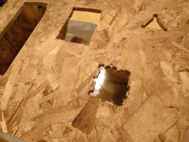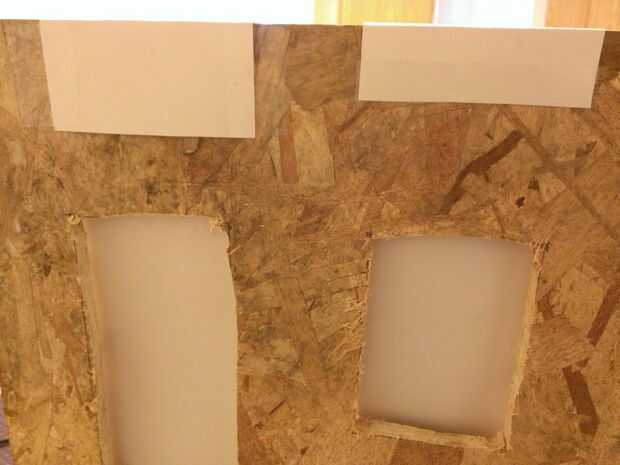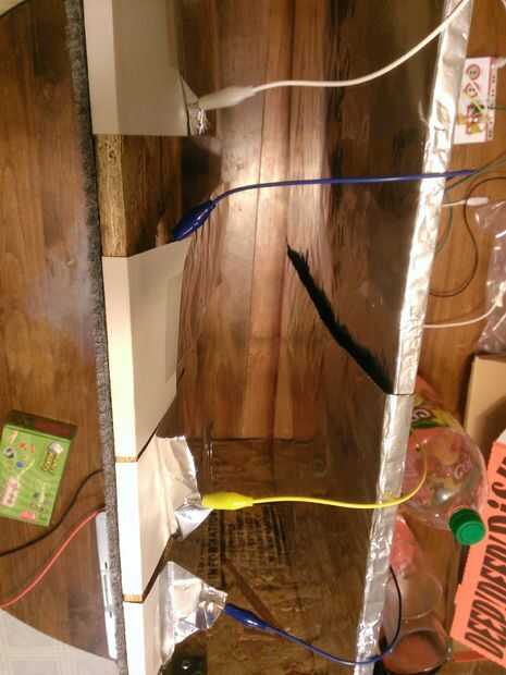 Cada uno tiene cartulina con papel de estaño en la parte posterior para actuar como un interruptor, cuando la bala de nerf pega la cartulina. Con cinta adhesiva la cartulina en la parte superior de la pieza frontal de madera para que cuelga libremente.