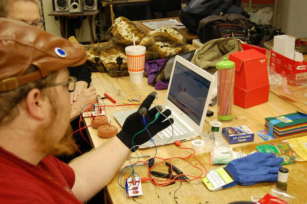 Uno creía hacer un guante de entrada. utilizar guantes de pantalla táctil barato que fue encontrado que podría hacer la tierra de pulgar y el índice y el dedo medio hice dos entradas diferentes. Estaba sólo prototipos solo alegator sujetado al guante, pero un poco educados dentro del guante y penetra a través de la tela, o abajo cosido en hilo conductor podría funcionar bien. (también hay instructables sobre cómo hacer tu propio tocar los guantes de la pantalla, usted podría hacer cualquier número de puntos de contacto.