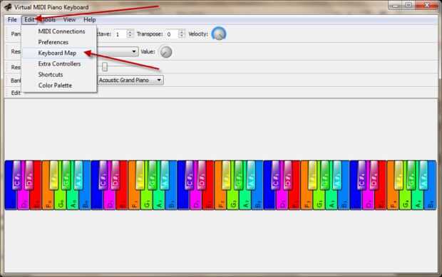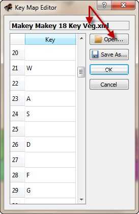 VMPK abierto y carga el archivo de mapa de claves ("Makey Makey 18 clave Veg.xml") proporcionado en el paso 1 de este Instructable. Vaya a Editar >> mapa de teclado y una nueva ventana abrirán llamada "Editor de mapas de clave". Haga clic en el botón "Open" y buscar el mapa clave que guardó en su computadora, abra el "Alex Veg.xml clave de 18 Alex" y haga clic en Aceptar.