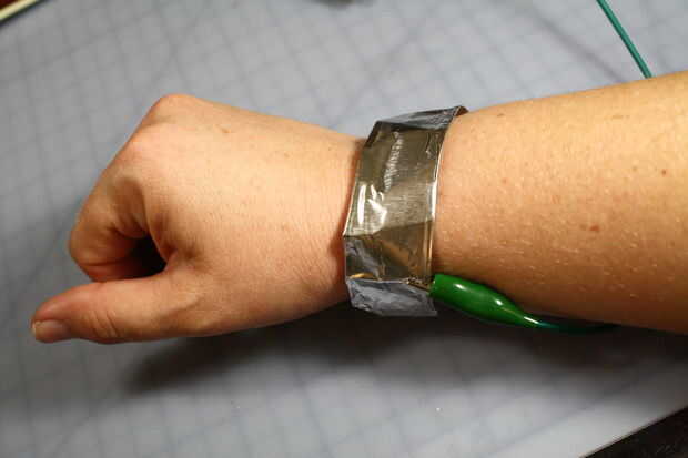 ¿Su cuerpo es parte del circuito, o no lo menciono? Le conecte un punto de tierra en el tablero MaKey MaKey a tu cuerpo a través de un brazalete metálico (o anillo de alambre) en el extremo de un cable de piel de cocodrilo. Poner en la pulsera, asegúrese de que todo está conectado y encendido y cuando la mano izquierda toca los trastes, completarás un circuito que recorre su cuerpo y MaKey MaKey enviará las pulsaciones de teclado a su ordenador.