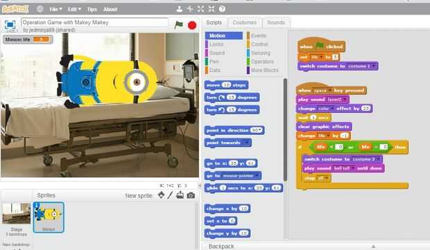 Mi juego se basa en la guía de proyecto Makey Makey en http://makeymakey.com/guides/operation.php . Remixed el juego con el fin de tener un súbdito real en la pantalla que cambia de color cuando la alarma se apaga.