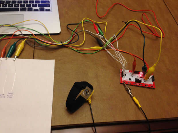 Como mencionamos anteriormente, el propósito de MakeyMakey es convertir pequeñas señales eléctricas en los unos y ceros que la computadora interpreta como números y letras. Este paso conecta los "tap pastillas" para la placa MakeyMakey, que entonces envía el patrón correcto de ceros y unos al puerto USB de la computadora.